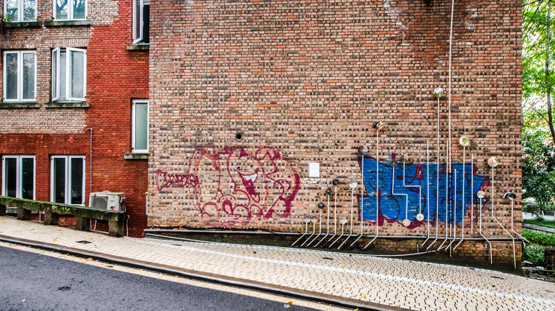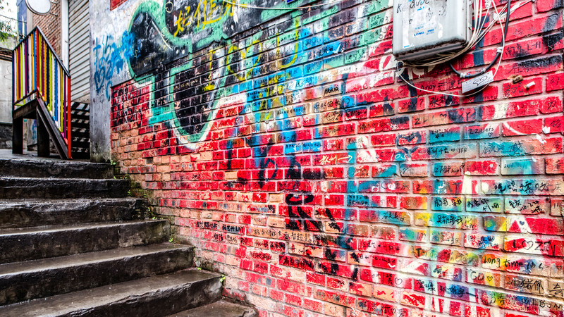 在交通茶馆外,艺术气息浓郁,街边围墙、转角,大楼外立面等地方尽是彩色的涂鸦。