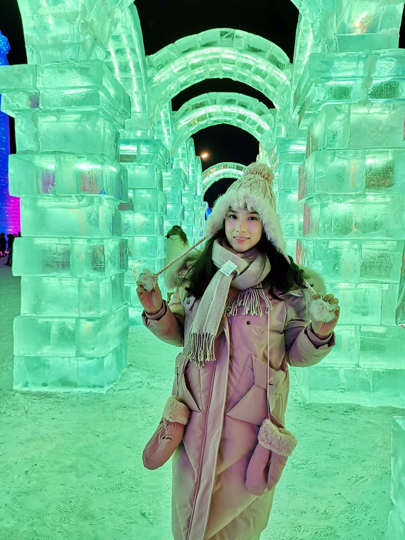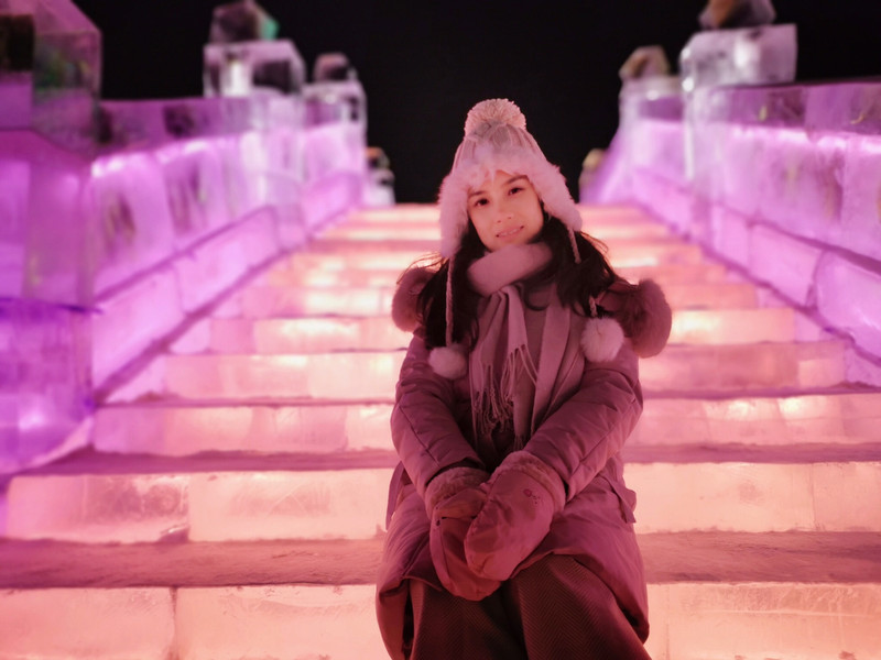 参观完教堂,赶紧回去穿装备,准备奋战冰雪大世界。发热鞋垫加两双厚袜子,前胸后背各贴了两片暖宝宝,5件上衣,3件下衣,感觉自己都要燃烧起来。冰雪大世界据说有零下30度,不过我去的当天运气好,没风所以穿多点也不觉得冷。