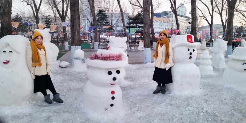从果戈里书店出来已经快4点了,赶紧打车去了poi/34011.html松花江畔,司机把我们放在满是雪人的街道。