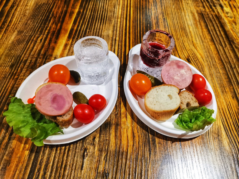 在这里可以凭品酒券免费品尝冰杯斟满的伏特加酒与酸黄瓜熏肠等美食,男士是伏特加,女士一般是红酒。