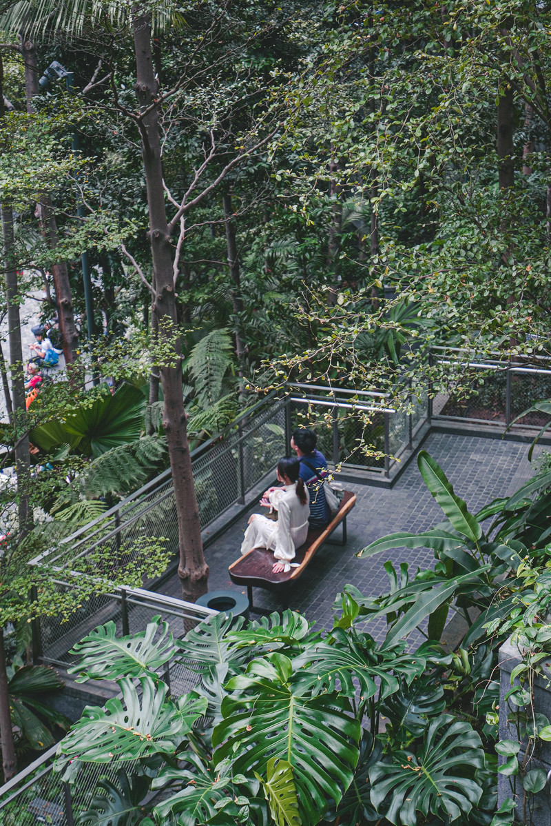 整个星耀樟宜一共有五层楼高,集合了娱乐、餐饮、购物、住宿和航空等等功能,中间这个40米高的巨大雨漩涡简直是星耀樟宜里人气最高的区域,也是世界最高的室内瀑布,在雨漩涡外围是一片巨大的森林谷,这里的植物是来自于世界各地,据说其数量之多也让星耀樟宜取代滨海湾花园成为新加坡规模最大的室内景观花园呢。