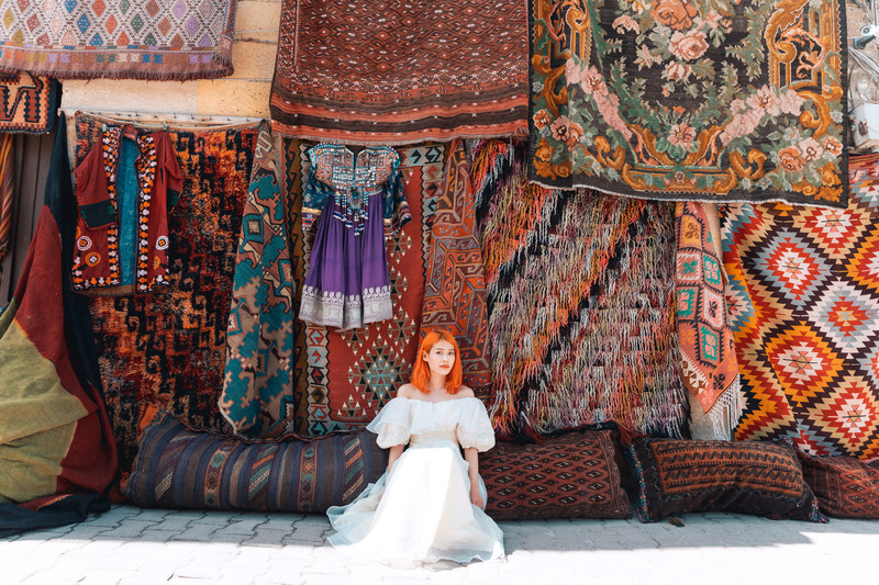 坐完热气球回到酒店,换上了一件轻纱裙,我们来到了 格雷梅 镇上。 格雷梅 镇不大,所以很容易就能找到这家网红地毯店Galerie Ikman。地毯店面积很大,里面有两层,地毯很多,而且提供付费的航拍服务。拍摄照片需要付费,包场700 里拉 ;共享场地,拍30分钟,350 里拉 。比我之前看到的价格贵了很多,不知道是不是因为我穿了婚纱的缘故。因为我们觉得不划算便放弃拍照,只在门口拍了几张。这家店有ins账号,拍了照片可以艾特他们。