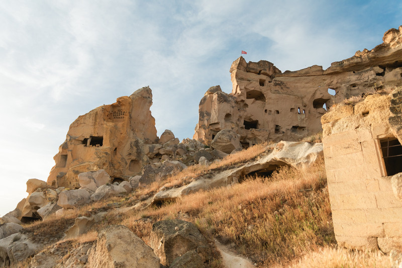 第一站乌奇萨城堡,导游介绍了很久这个景点:我们脚下的是火山灰,几百万年前小行星撞击地球, 卡帕多奇亚 的火山喷发,所以 卡帕多奇亚 现在地上铺着火山灰,火山灰上面铺着熔岩。由于熔岩不容易被腐蚀,没有熔岩的土地被慢慢腐蚀,所有形成了沟壑,也就形成了 卡帕多奇亚 现在的地貌。