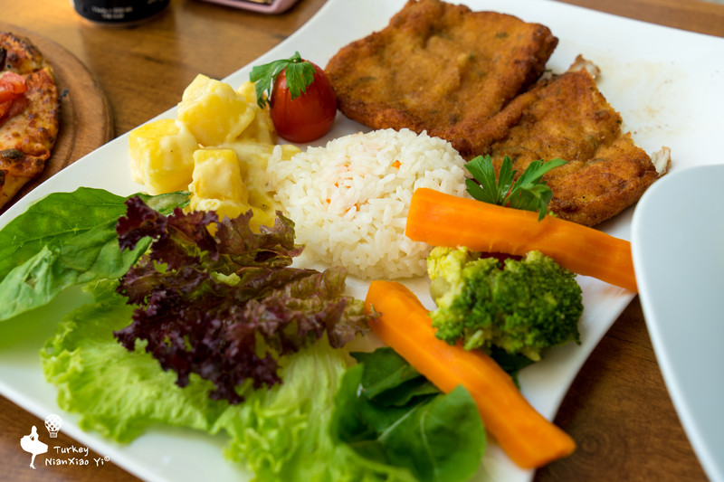 在码头找了一家人比较多的餐厅,点了鸡排、海鲜披萨,味道很不错