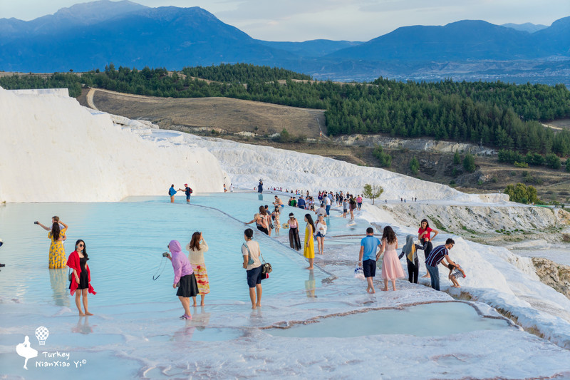 比较推荐接近黄昏的时候在棉花堡温泉池,可以看到落日余晖溅落,棉花堡在阳光的变化下,或红或黄或粉的变幻,很是不同