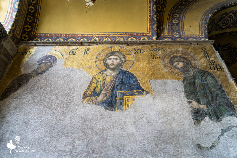 一进入大教堂的大门,抬头向上看,是圣索菲亚教堂最著名的马赛克镶嵌画之一《万物的主宰耶稣》。耶稣基督坐在中央,利奥六世跪在他的脚边,耶稣两旁是圣母玛利亚和大天使加百利,耶稣手里拿着一本书,上面写着“平安与你同在,我是世界之光”。这幅画代表基督将永恒的力量赐予拜占庭皇帝