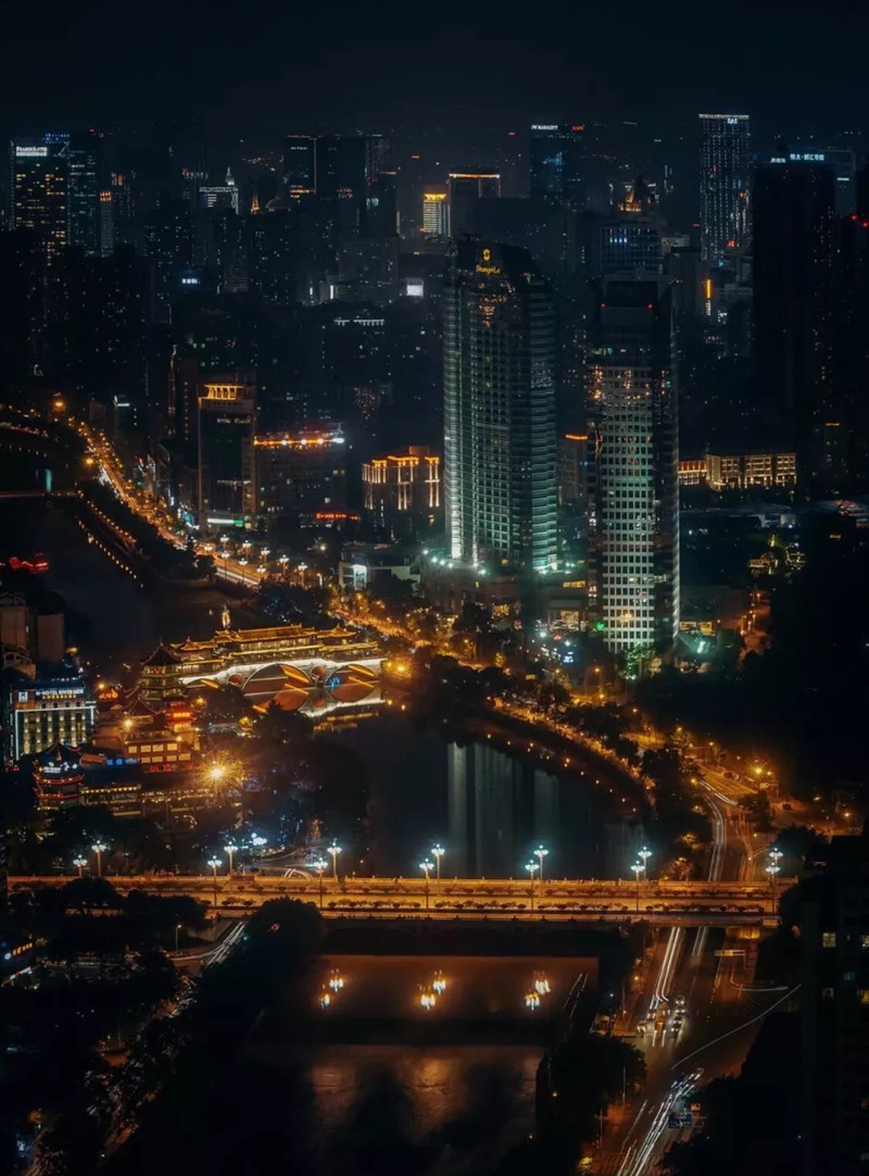 夜色渐浓,酒吧开始热闹起来,抬头就能捕捉到339七彩的灯光,在一众暖黄色路灯中,格外惹眼,廊桥就静静地躺在锦江之上。