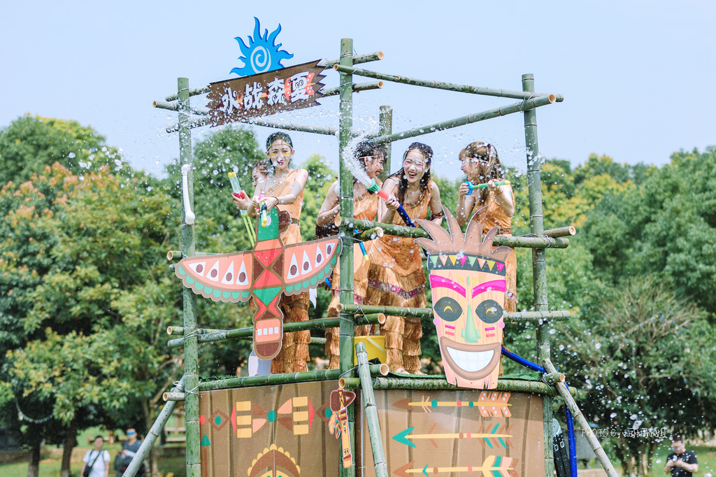 这个夏天来宝盛园,还有一个茅山野营生活节的活动,我们去的那天刚好赶上了开幕式,场面异常热闹,妆扮成原始时代的小哥哥小姐姐,还邀请游客一起,开启了一场热情的泡泡Party和激情水战。