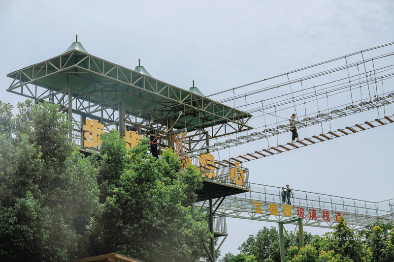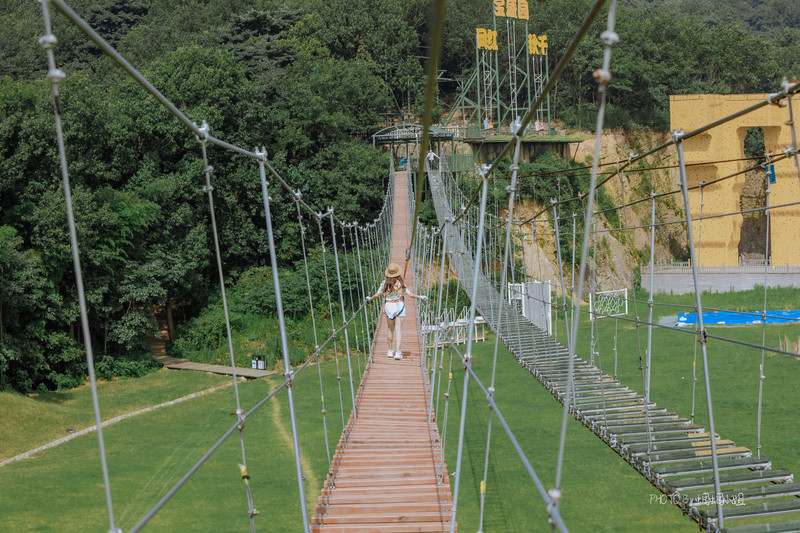 在大草坪的旁边,还有一个高空项目区域,最近几年比较火的悬崖秋千、高空吊索、玻璃栈道、步步惊心等高空项目,在这里都可以玩的到。