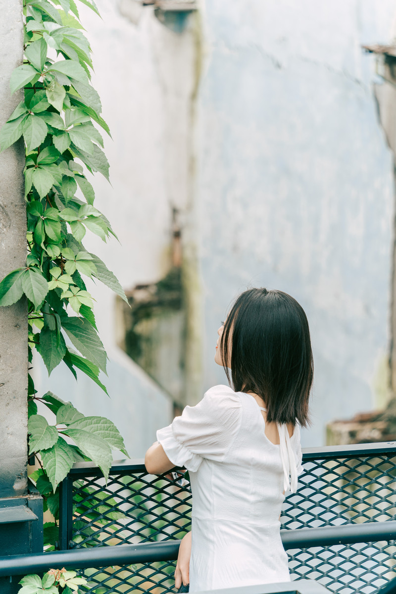 小清新的照片,整体调色都调得比较日系清新,白色连衣裙和背景的植物都比较搭配,花生建议不要让人物刻意摆拍,这张她转头撩头发抓拍的就显得自然很多。