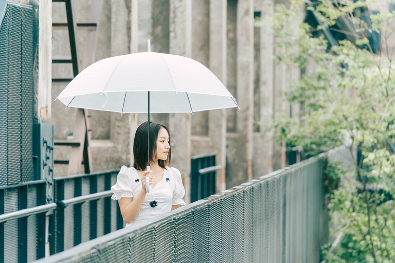 这张有透明伞做道具,手上没有那么空了,腿伸一点会看起来更细长,用铁轨形成了画面的延伸感。