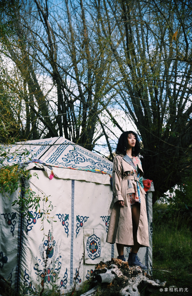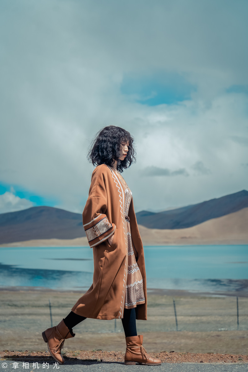 在拍摄上:注意服装色彩不要和背景太过于一致。比如蓝色的湖,可以用卡其色的服装配,或蓝白图案的裙子,避免蓝色的湖配大片纯蓝色的服装;