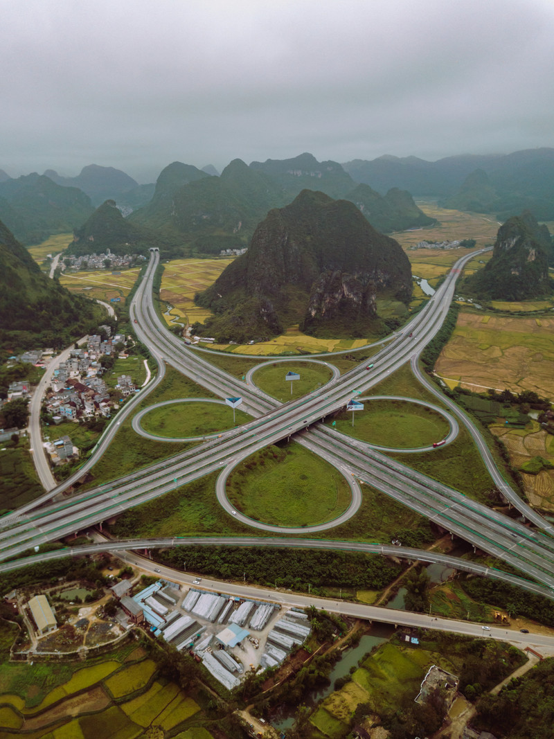 因为公路穿行的地区都是喀斯特地貌山区,穿梭在广西秀美的山水之间,沿途可欣赏喀斯特地貌所特有的奇山怪石。没有阳光的日子,我们一路与青缈的云雾为伴,路边是大片稻田,仿佛身在巨大的仙境画卷中行驶。据说最美的一段是百大特大桥路段,横穿三座大山,我们并未开到那段路。