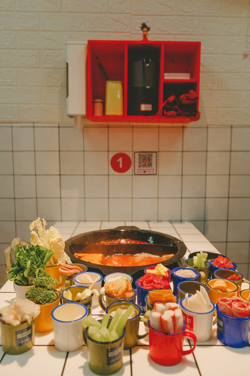 好在最后还是安全到达了唐蛊蛊火锅店,这家是自助的,每份菜都是小份,可以选很多种类,特别适合我们吃。