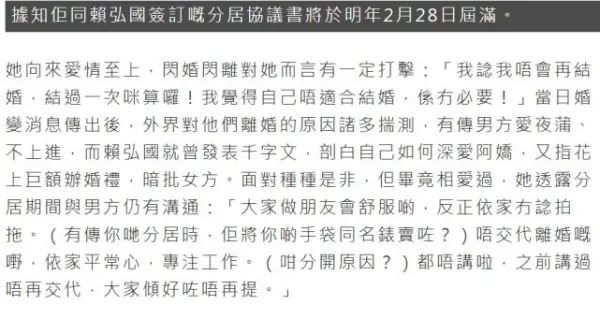 近日,twins成员钟欣桐阿娇在接受媒体采访时,有媒体问到她和赖弘国的婚姻是否还能有回转的余地时,阿娇在面对媒体时也敢于直面自己的婚姻问题。 阿娇坚决的说没有,说是被婚姻吓怕了,并表示自己不太适合结婚,以后也不会再结婚了,没有那个必要了,只要当好天后,专心做自己的事业就行了。 阿娇的感情一直都不是很顺利,当初她和陈冠希的"艳照门"事件,让阿娇的事业一度跌落低谷,瞬间身败名裂。 用了很多年走出阴影后,与韩国电影制片人陷入恋爱,但是这段恋情总共也就维持了十个月,最后也是以分手收场,直到之前她公开了和赖弘国的恋爱,甚至结婚,让众人以为这已经是一段尘埃落定的婚姻了,可没曾想到最后还是失败了。 当初,没有结婚前,男方就表示其实自己的父母反对他们结婚,也有很多媒体多次曝料赖弘国在与阿娇交往的期间还与其他女生交往,但是阿娇始终表示相信男友,不受众人劝阻,执意结婚,但是时间久了也会累的吧。 在结婚后,二人也是合体参加了很多活动和节目,其实在节目里二人的相处就不是多么的和谐,阿娇是一个敏感而且极度缺乏安全感的女生 今年5月她与丈夫赖弘国宣布分居,结束一年多的短命婚姻,引起轰动,好不容易等到新闻平静下来,她又在9月发生意外撞伤头部,右眉留下6厘米长的伤口…… 幸好,阿娇天生乐观,离婚与受伤对于她来说,好像都是小事,又或者,原生家庭带给她的童年伤痛、居无定所的恐惧感一直存在内心深处,她不相信自己能够拥有幸福。 现在距离正式离婚还有两个多月,阿娇表示,她与赖弘国依旧是朋友关系,两人会有沟通,但已经没有了爱情,所以一定不会复合。 阿娇与赖弘国闪婚闪离,婚姻只维持了14个月,赖弘国曾对媒体表示,他经历了两段失败婚姻之后,开始质疑自己在感情方面的能力,他已经没有勇气再度步入婚姻,以后只会恋爱不会再婚。 无独有偶,阿娇跟赖弘国的看法一致,她也认为自己不会再婚。 阿娇说,她尝试过结婚,举办了多场婚宴,也经历过离婚,做完这些人生大事之后,她才发现自己不适合婚姻,“我想我不会再结婚,结过一次就算了,我觉得自己不适合结婚,没有必要步入婚姻。” 赖弘国曾发表长文,控诉阿娇对感情不认真,在他求婚成功之后多次提出分手,赖弘国用尽全力挽回,才让这段恋情成功熬到结婚那天。 可没想到,婚后的阿娇还是不适应婚姻生活,提出了分居,并收拾行李从台北返回香港,单方面快递分居协议书给他,强迫离婚。 对于阿娇的任性选择,台媒方面评论指她可能想要证明,经历陈冠希事件之后,她在婚姻市场上依旧有竞争力、能够成功嫁出去,赖弘国只是她的工具人……对此,阿娇没有回应。 在最新访问中,阿娇不愿意交代更多离婚内容,也不再评论媒体对赖弘国的抹黑报道,关于赖弘国“出轨”“爱上夜店”“不上进”“嫌弃阿娇太能花钱”等等传言,阿娇都拒绝评论真假,以一句“现在不谈离婚的事了,要说的之前都说完了,还是专注工作吧”转移话题。 与赖弘国分居期间,阿娇说自己没有谈恋爱,即使身边有追求者,她也不会接受,她希望结束了一段婚姻之后,才重新开始。 一直喜欢小朋友的阿娇,认识赖弘国之前曾雪藏卵子,但数量不多,只有三颗成功,这样的数量其实很难做人工受孕,阿娇接受现实,“现在还没有遇到另一半,我也不想再去雪藏卵子了,看缘分吧,有机会就生,没机会的话就算。” 阿娇曾因为陈冠希事件受尽了伤害和网络暴力,心里留下巨大阴影,但赖弘国是压垮她的最后一根稻草。在这次与赖的婚姻中,她也重新鼓起了勇气,但最终以失败告终,而赖对阿娇的态度和行为是阿娇不想再结婚的根本原因! 你怎么看待阿娇不像结婚的想法?你觉得她还能找到幸福吗?如果你对阿娇的想法有什么想法,请关注评论转发,让更多人看到,参与进来!