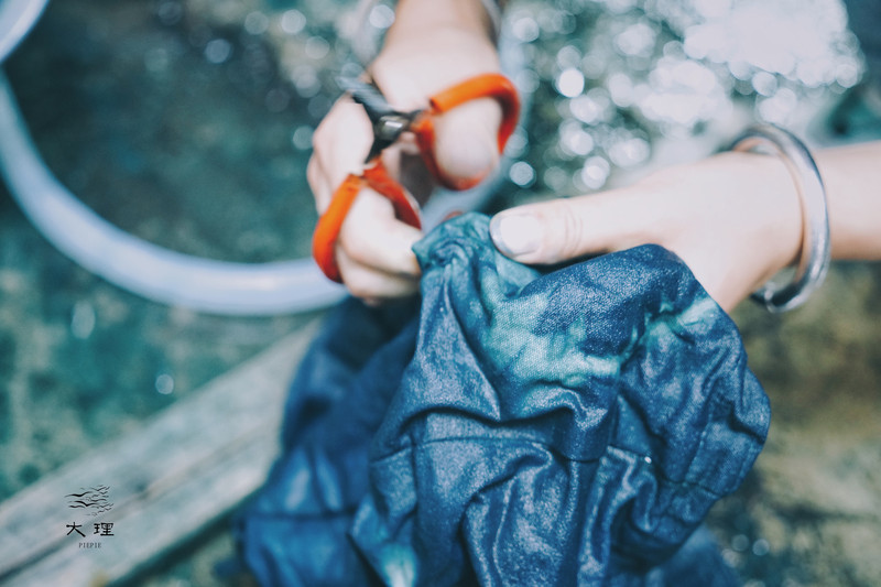 染色时把织物某些部分用针线或其他工具扎起来使之不能着色,主要分为两步,扎和染,所以称为扎染。古法扎染的工艺复杂,至少需要设计、制版、印刷、扎花、浸泡、脱浆、沉染、氧化、拆线、漂洗、晾干才能最终成型。而在这之前,还需要采集板蓝的茎叶制作染料。春天种下板蓝,七八月采摘,把采集好的茎叶加入水浸泡,再请专门的师傅打一天靛蓝,在沉淀的泥 巴里 加入米酒和米饭,让它自然发酵一个月左右,优质的染液需要呵护更长的时间,才能染出属于小白童年里的蓝。