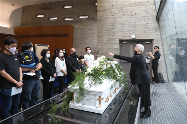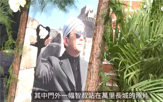 廖启智的遗照也曝光,教堂门外摆放了一张廖启智站在长城的照片,廖启智此次安息礼有两张遗照,在长城这张照片,是廖启智生前自己选好的遗照。