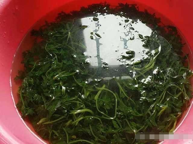 2、将焯好水的艾叶放入盘中倒入清水清洗一边!