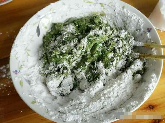 5、碗里放入糯米粉、红糖,慢慢倒入艾泥用筷子搅拌花絮,和成面团!
