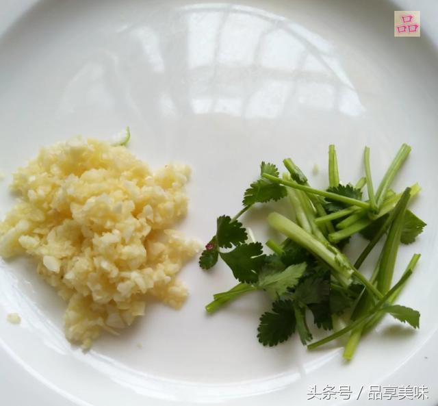 7、找一个空盆,把蒜末放入盆中,加入点盐,一点鸡精,半勺白醋,再加入半勺葱油,