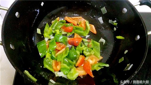 4、锅内放少许底油,下入葱姜末炒香,再下入青红椒翻炒至断生