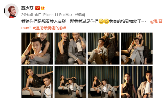 16日,蔡少芬晒出与张晋的夫妻合体大片,俊男靓女同框惹人羡慕。并发文自侃“我猜你们想看双人合影,那我就满足你们,我真的拍到抽筋了~”