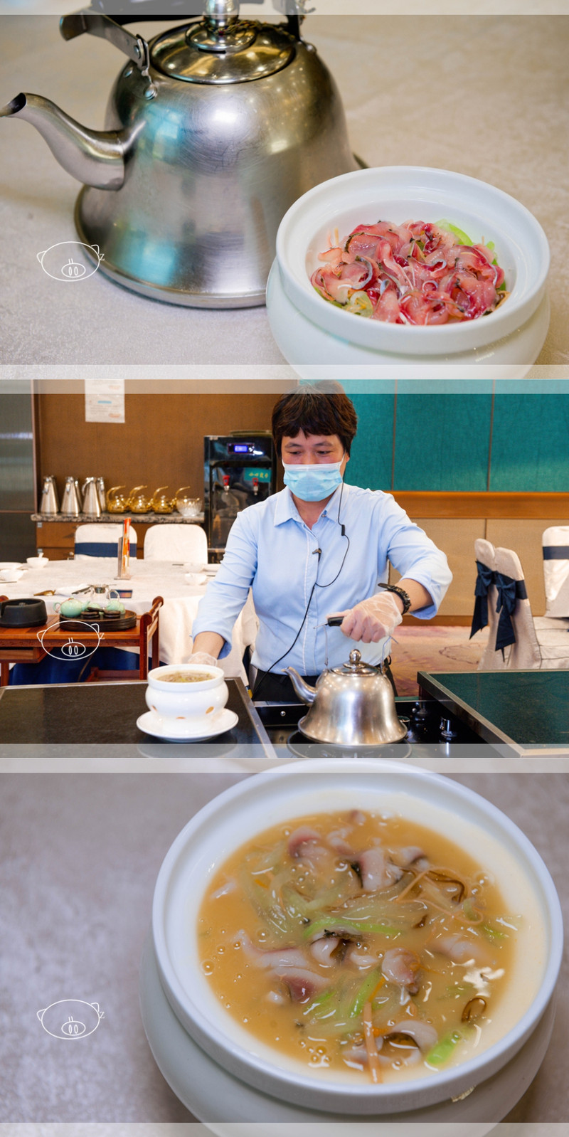 节瓜拆鱼羹 和传统的顺德拆鱼羹有所不同,上桌是一盅上铺新鲜已拆骨头的鱼片,下面是用黑毛节瓜切成的瓜丝和姜丝、陈皮丝、雪耳、紫菜、木耳等配料,由厨师推着料理车到餐桌前,把鲜汤加热至滚,淋在鱼片上,搅拌均匀可食用,鲜!!!