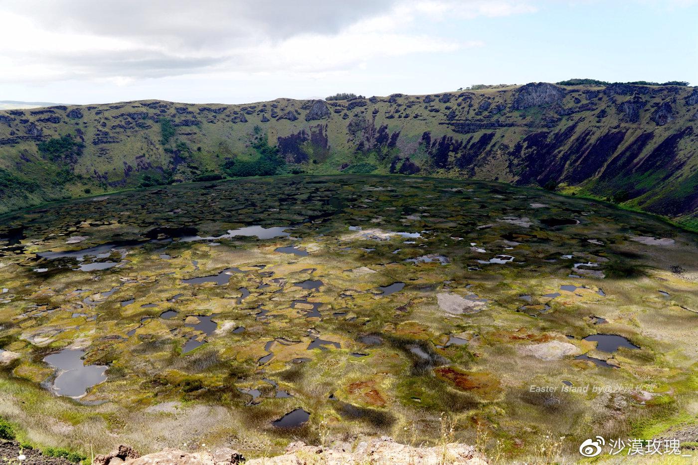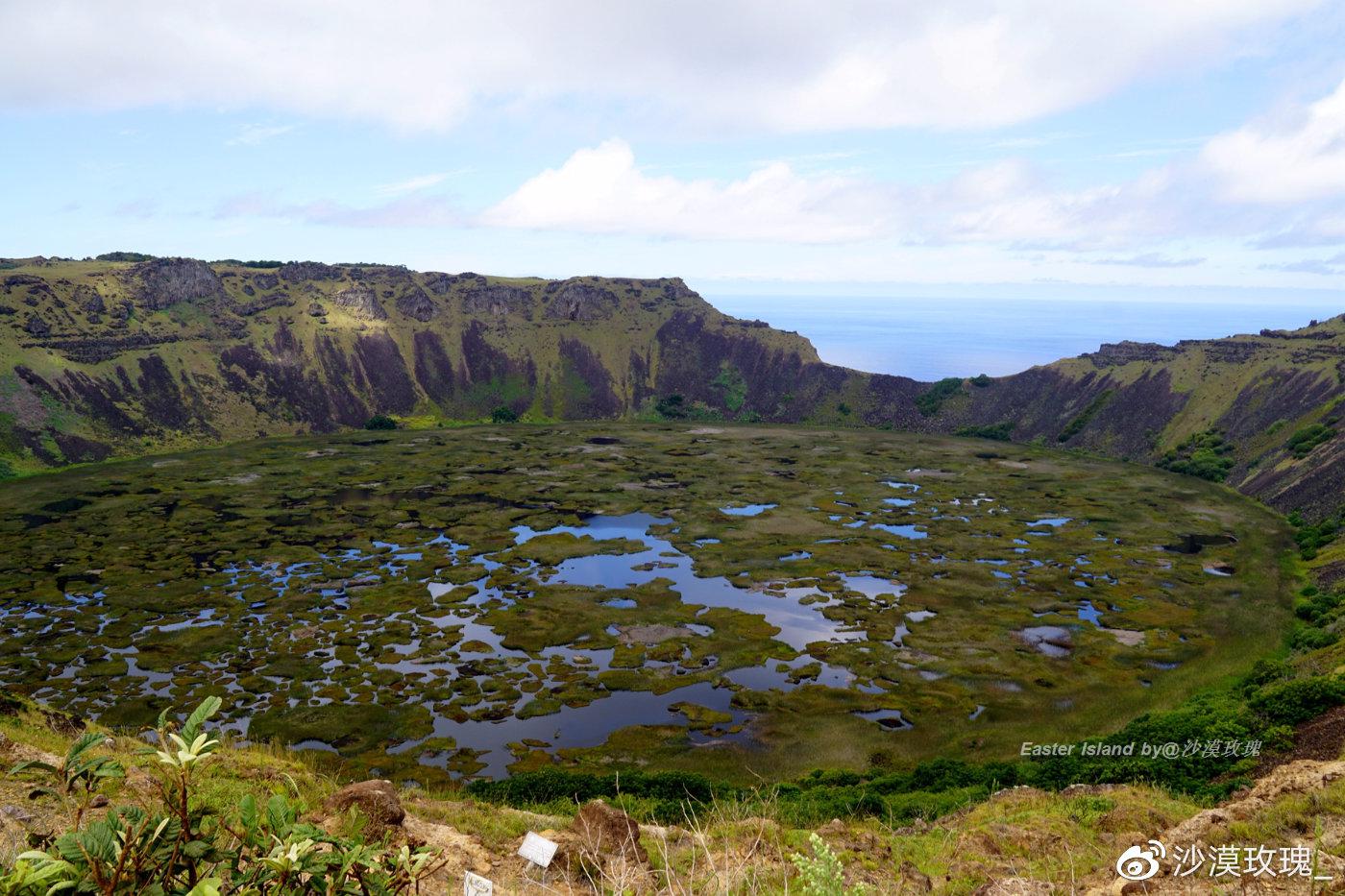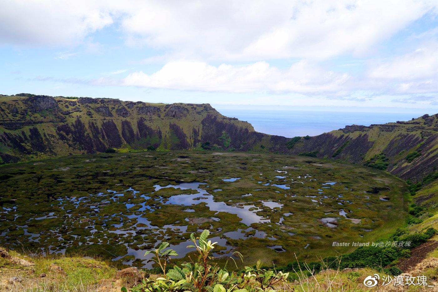 硕大的火山湖如同一座被芦苇包围的巨型池塘,如今被各种藻类和植物覆盖,芦苇在从一角缺口透进来的海风中轻轻摇曳。虽然阳光明媚,但似乎一阵狂风暴雨就能将整个湖倾倒回海中。看上去湖水有点脏,但在四周都是浩瀚无边的大海中,这口湖是复活节岛上重要的淡水源地之一。