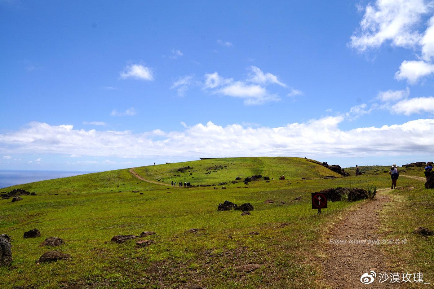 经过展示厅走出来沿着通往山巅的步道攀爬,宁静的海面在脚下展开,初抵复活节岛的心情被这一番景象荡涤得更加明快。在这里还能更接近前面提到的火山湖。