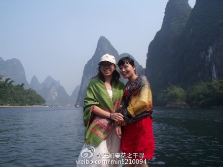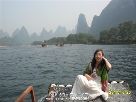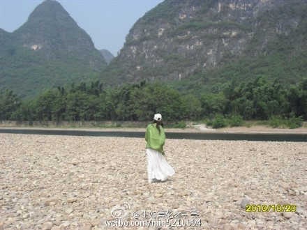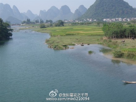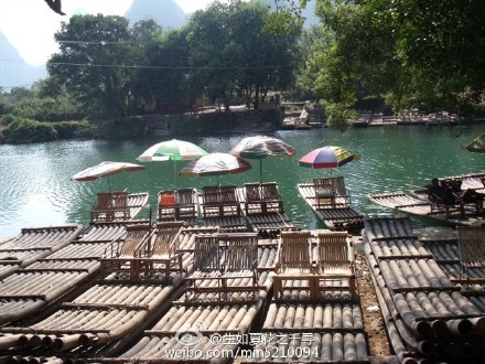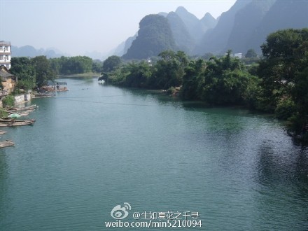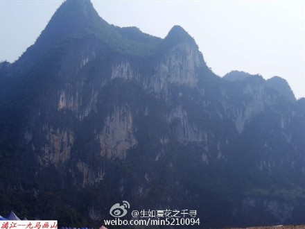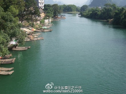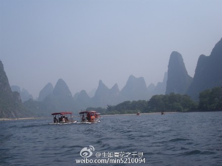 在这么美丽的地方,自然来两张留影纪念到此一游啦。好想唱一首: 让我们荡起双桨 小船儿推开波浪 海面倒映着美丽的白塔 四周环绕着绿树红墙 小船儿轻轻 飘荡在水中 迎面吹来了凉爽的风 第二天的行程就是坐船游漓江了,这个景点去过的人肯定都知道:九马画山。 其实真的很佩服这些取景点名字的人,想象力得非常好,才能有这样诗情画意的名字。游船一路下来,各种各样的景点名字,一边看一边想象,也是蛮醉人的