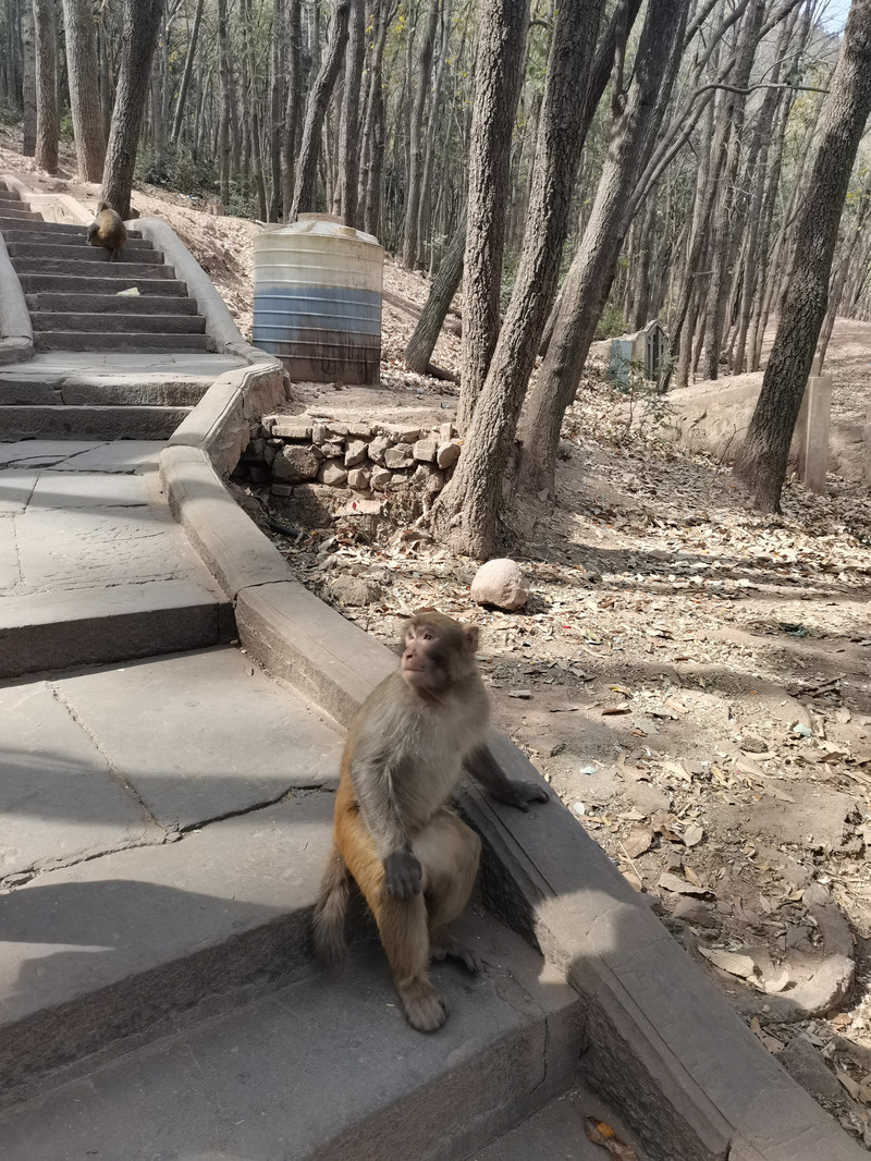 从博物馆往上走一段路才真正到庐山脚下,刚到脚下就有很多的猴子,树上挂着,山路上坐着,悄悄的偷摸躲在树后面的,房檐上的,还有为了抢食互相打起来的,可谓是相当有趣。(PS:真是刷新了我对野猴子的印象,果真跟峨眉山的猴子不一样,庐山脚下的猴子可以跟人互动,似乎要温和许多。不过最好还是不要带吃的,庐山的猴子抢吃的可是明目张胆,一旦从你身上抢到吃的,还会跟你一段儿;如果没有吃的,那就放心大胆往前走)