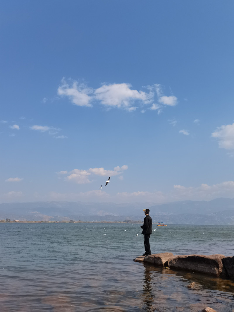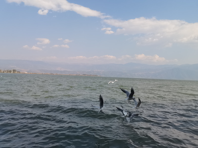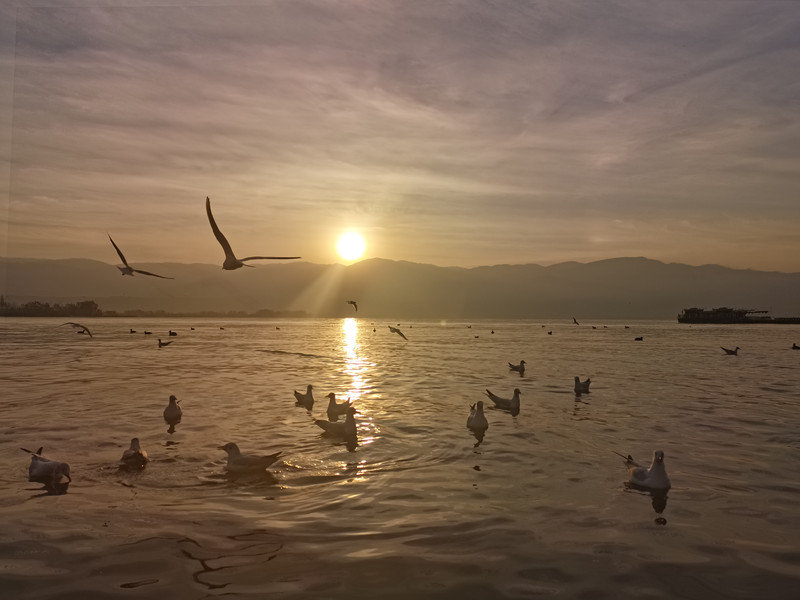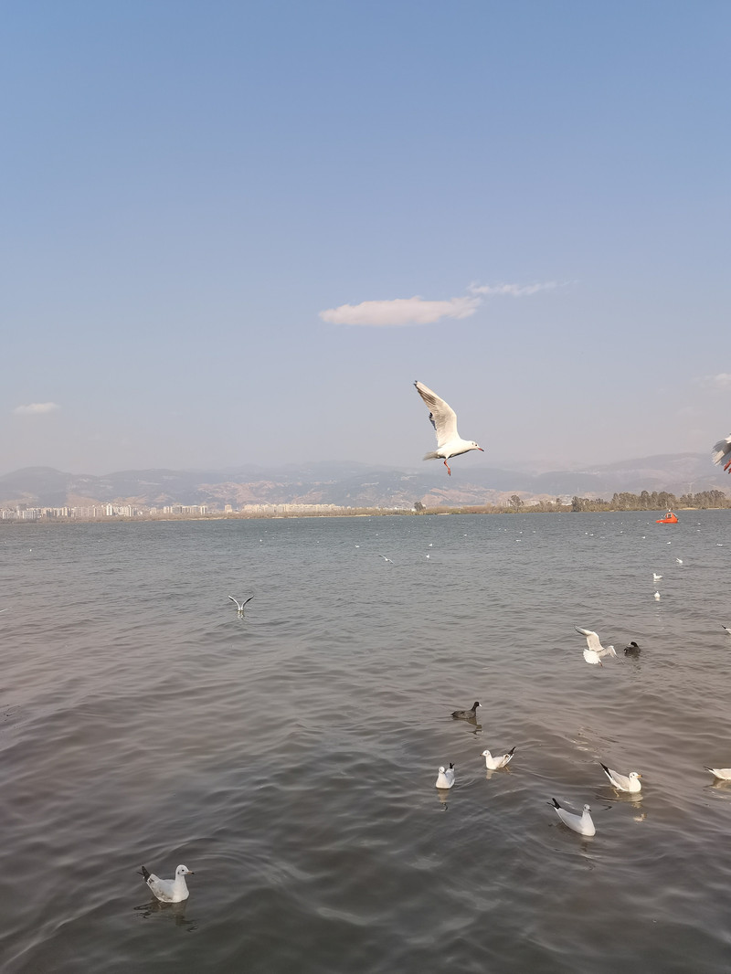 2月16日 公交106路从 酒店 — (月色风情小镇站下车)到邛海,先去酒店办理入住休息了一阵(住得是术下酒店,酒店环境地理位置都很不错,出门几步路就是海边,不过是简约风,里面的设施设备(床单都有破洞,空调声音很大)似乎不值得400多一晚的价格,其他方面倒是很不错),下午3:30左右去海边。听,海水拍打海岸的声音,看,骨顶鸡在水里扑腾打滚的样子,瞧,这海鸥没动的时候真不像海鸥,倒像是白色的漂浮物。(PS:如果想近距离接触海鸥,可以花几元钱买一袋饼干,海鸥便一群一群的来了;另外还可以坐船在海上溜一圈,大概是30元-50元/人,根据船的类别以及人的多少而定)