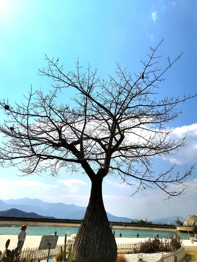 3、金杯半山米易太阳谷:听说这个地儿除了看花,没什么好的;从外面看也还没什么花开,本来手机相机都没想用,结果天哪,里面那几颗树太可爱了,像是一个个大肚杯,第一次见这么可爱的树。对了,网上很火的日照半山酒店就在这里面,看外形确实挺好看的。