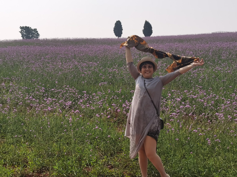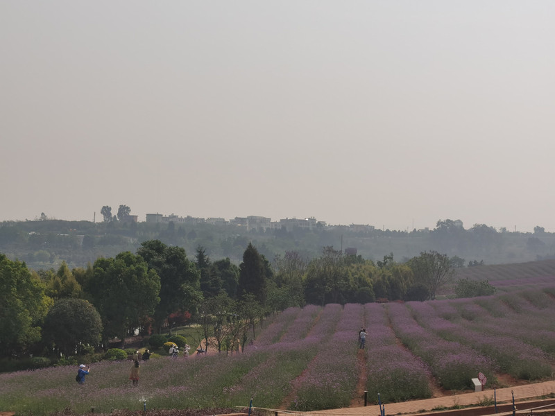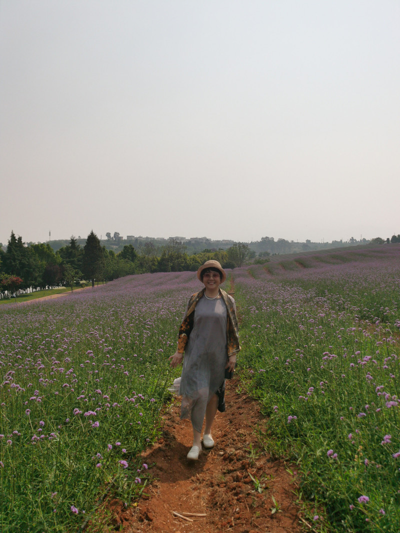 站在印章坊前的山坡上,极目眺望,远处的美女樱、暮春菊、三角梅和闪着波光的小河以及近处随风摇曳的绿树,构成错落有致艳丽绝美的水粉画,正值薰衣草花期,大片的薰衣草在阳光下闪耀着紫色,营造出梦幻般的感觉。