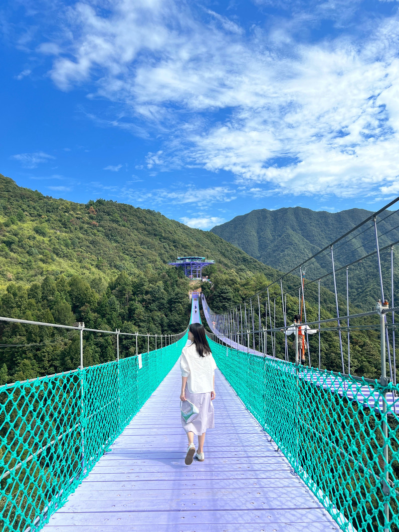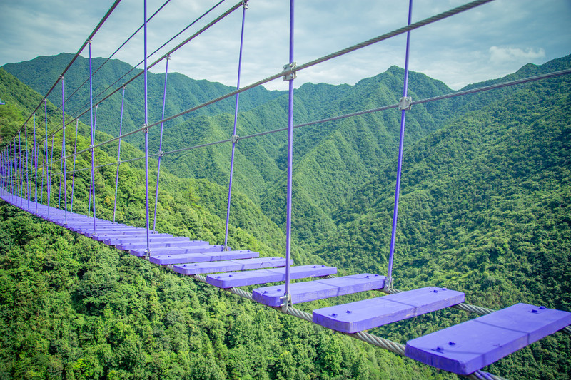 桐庐天子地风景区的云梯天桥全长300米,是在山的两边建立的索桥,胆子大的可以走步步惊心,会有装备保护,全程可以欣赏无遮挡的高山美景,非常的刺激。
