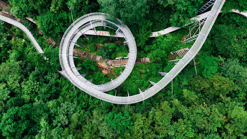玻璃滑道段螺旋式漂流下降,超高透光度玻璃让人感觉就是在空中森林玩漂流,体验感太棒了。