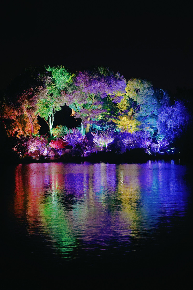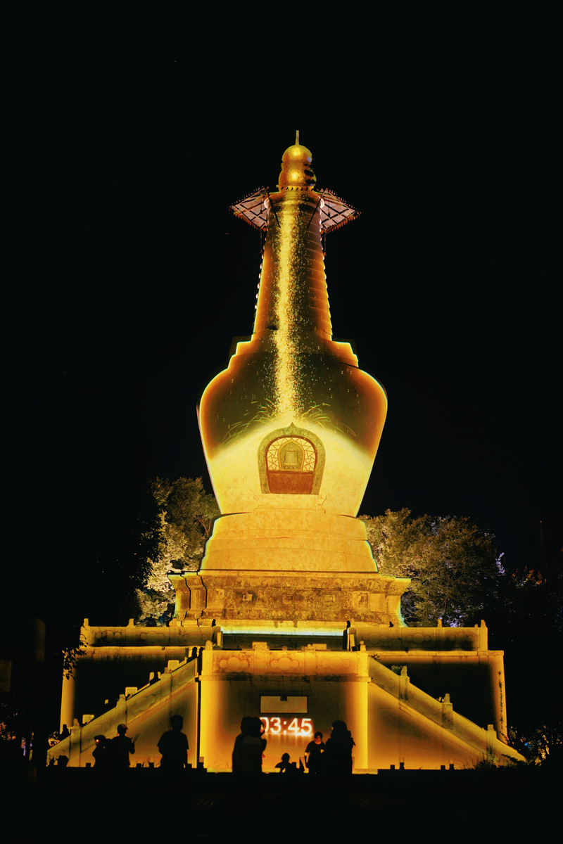 对面的钓鱼台恰恰相反,有一种空灵、寂静之美,它和它的倒影,孤单的立在水中、上下交融,在无边漆黑的夜空之下,明黄的亭子反倒让人心头一暖,中国山水画特有的留白之美,在此刻淋漓尽致。