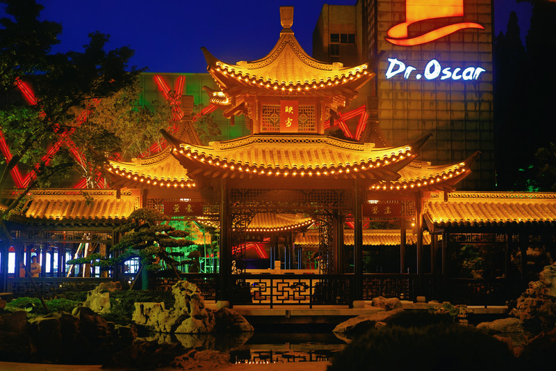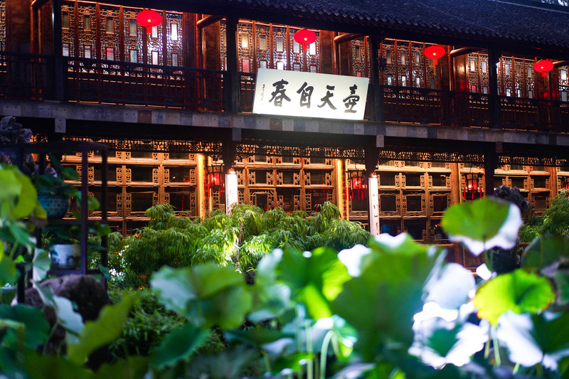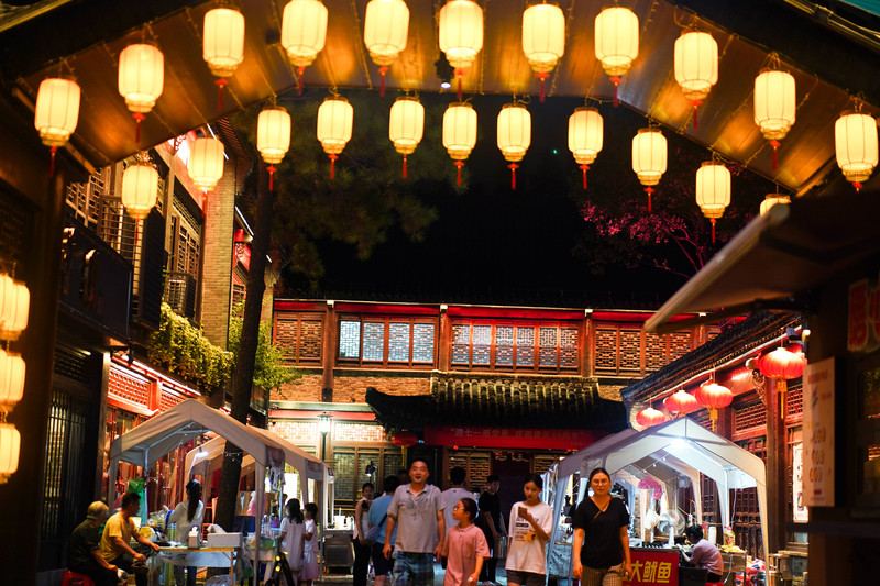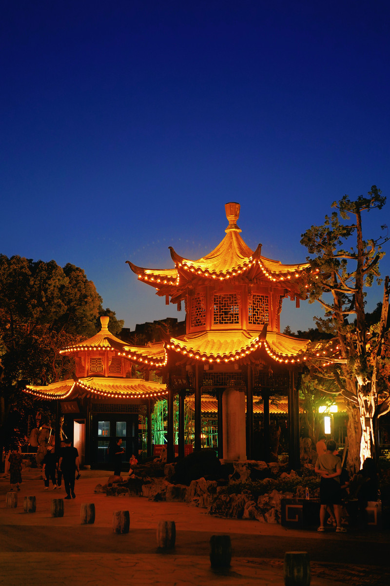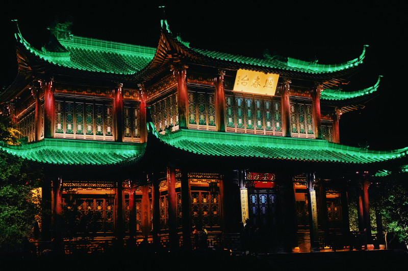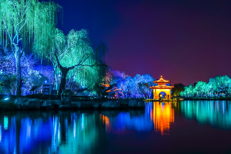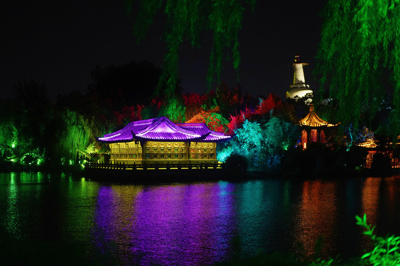 沿着河堤走,你会路过一段厚重的城墙,一座恢弘的天宁寺,走进寺庙,虽然灯火璀璨,但肃穆庄严不减,最后来到翘角飞檐的文汇阁,它是清代七大藏书楼之一,虽然是重建,但其历史可以追溯到1780年,阁内收藏者《四库全书》,白天可以进去参观游览,夜晚则在外欣赏夜色,也是及其舒服的。