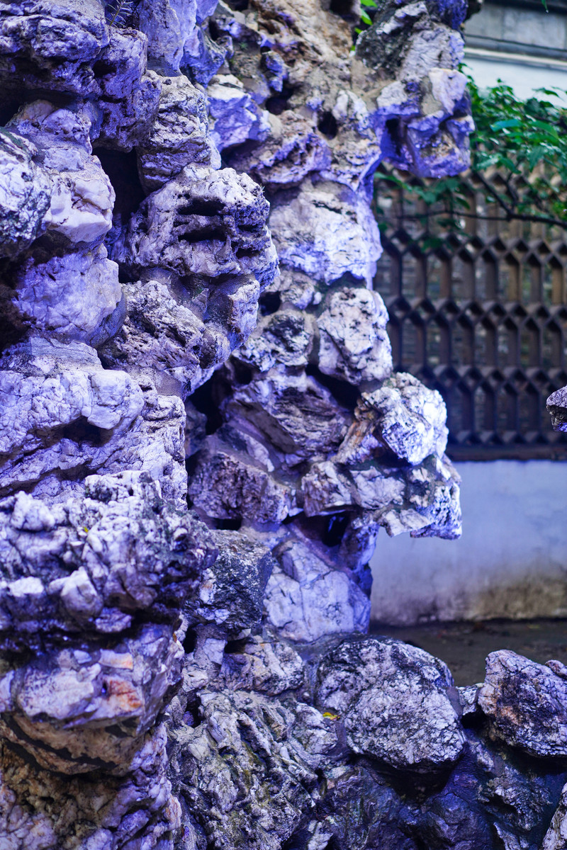 冬山则用了洁白的宣石,尤其在夜晚,透出冷冷的雪光,巧妙的是墙上开了四行圆孔,风吹过,便有风雪呼啸的气氛。
