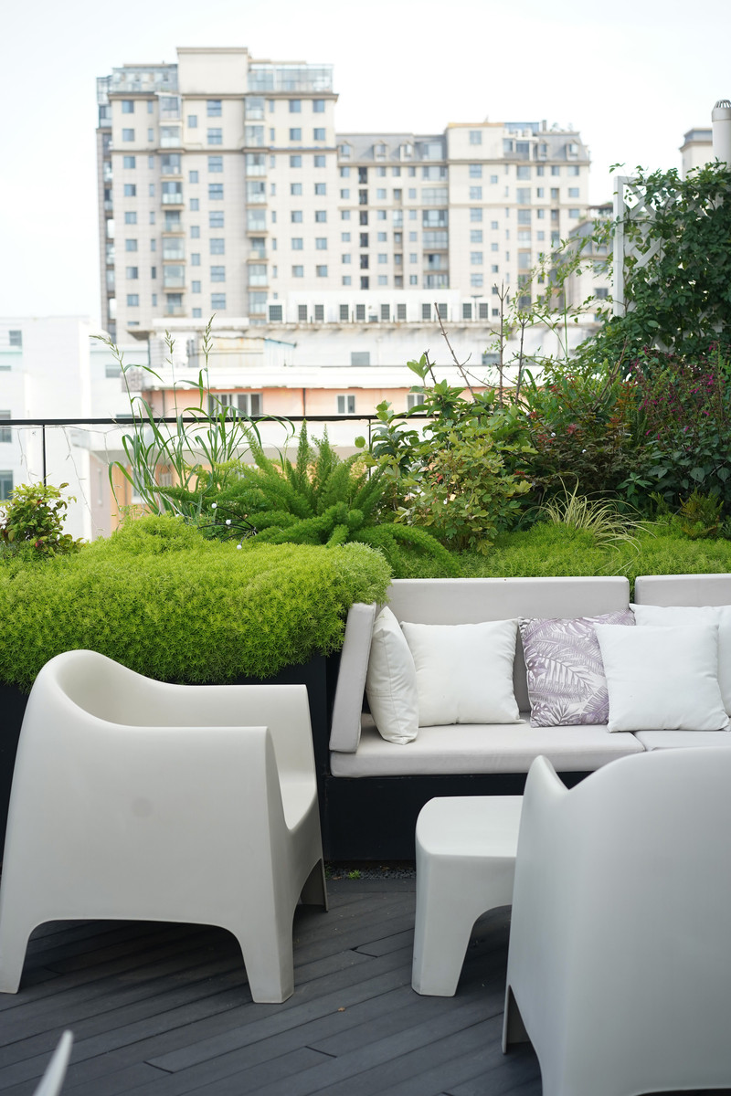 春景营造雨后春笋的意境,嶙峋的假山边,竹影重重,并有石笋穿插,这是早春之景,花坛里牡丹芍药绽放,这是深春之景。