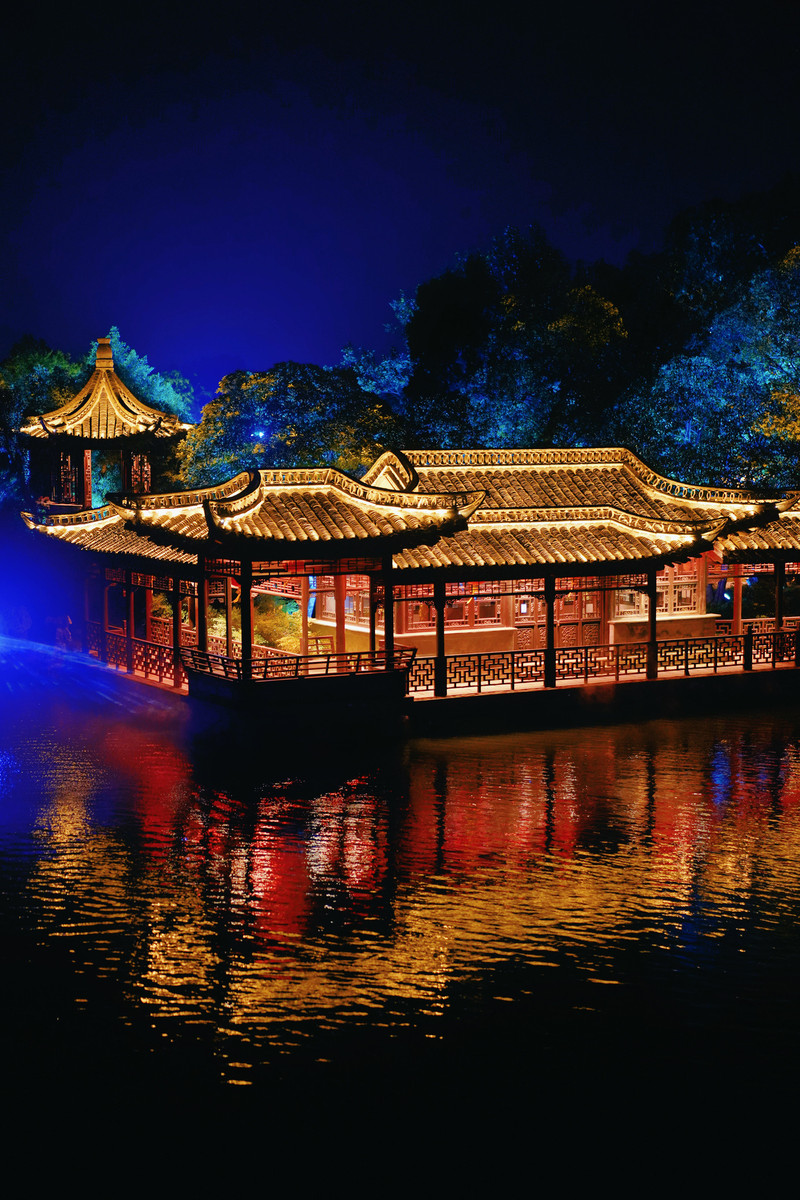 来扬州怎能不游瘦西湖?几年前我是白天身着古装游览瘦西湖,当时晴空如洗、绿柳如烟、繁花似锦,非常惊艳,3年后的今天,我突然发现,夜晚的瘦西湖原来更有一番韵味,令人沉醉。