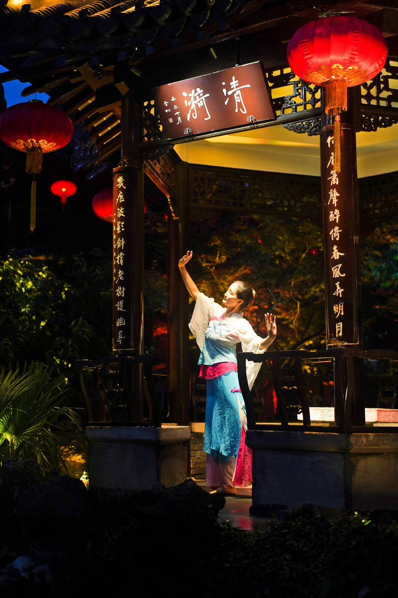 夜色中的个园,悠扬的古琴声从某个亭子里穿出,女子突然在廊下起舞,管家提灯带了一群年轻人在花园里玩游戏寻宝,个园的夜晚如同穿越一般!