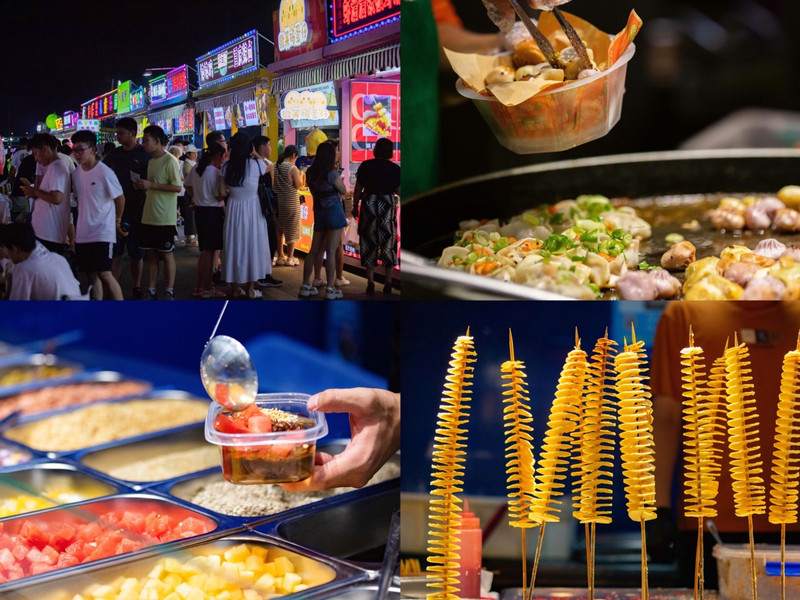 晚上气温凉爽,超级适合逛夜市,吃小吃。市集灯火辉煌,各种不同的美食店铺一字排开,冰粉,串串,鱿鱼,小龙虾,你想要的一切这里都有。