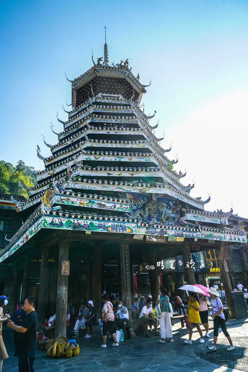鼓楼是侗寨的标志,从外观看像一座宝塔,气势雄伟,还没进入村寨就很醒目。鼓楼上一般都挂有一支鼓,过去,当寨子遇到外敌入侵,失火或议事之时,便登楼击鼓,召集寨民,鼓楼因此得名。鼓楼是寨里集会议事、订立款约、处理问题的会场,也是寨里群众工余饭后休息活动场所。