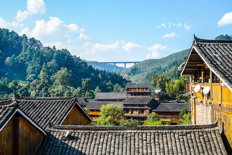 从住宿的地方向外望去,古朴的侗寨与远处的高速公路。