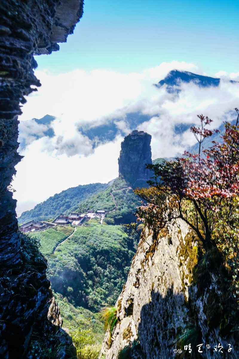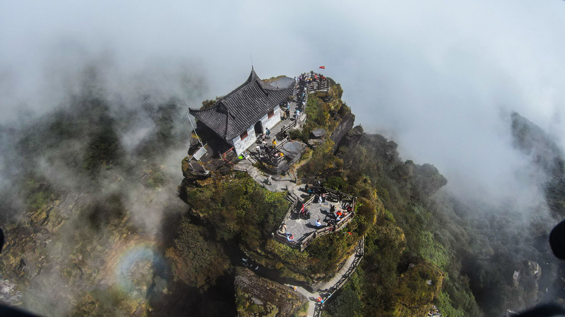 老金顶。要想在梵净山两个金顶都能赶在云雾缭绕之前爬上去,那就需要早点开始从山下爬上来。当地人说,就我们遇见的这种晴天,基本上每天下午2点左右就会开始起云雾。我俩就属于计划不足,老金顶爬上去,下来再上红云金顶的时候,已经仙气飘飘了,导致红云金顶上去后,面对面我都看不见老毕了。我们居然还在这种情况下,强行起飞了大疆,结果就是……大疆受到了重创,直接撞向山崖,一副桨叶损毁了……幸好机器没有直接坠崖~~~所以,这种航拍的照片,就没有红云金顶的了,因为已经什么都看不见了~~~一片白茫茫