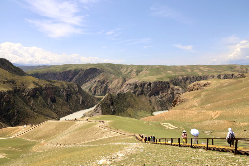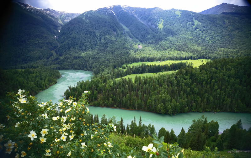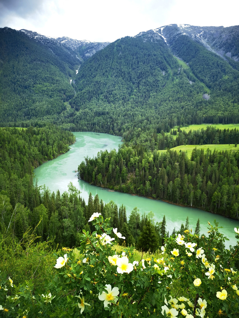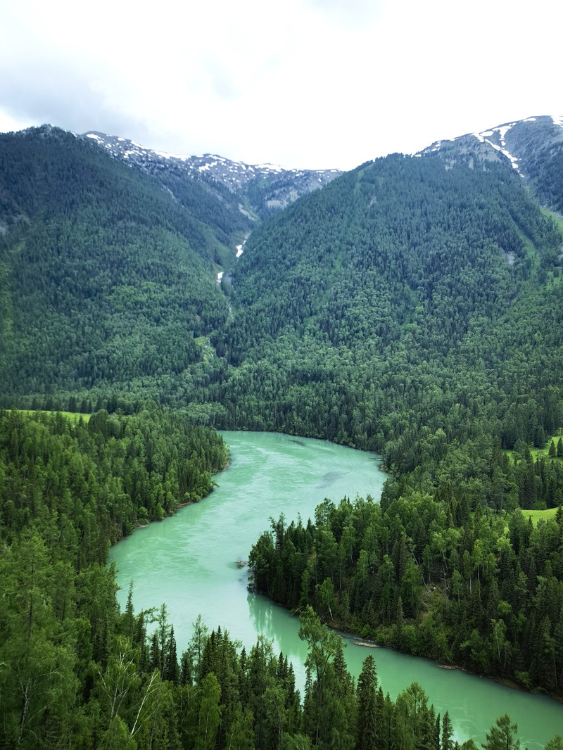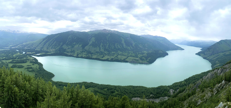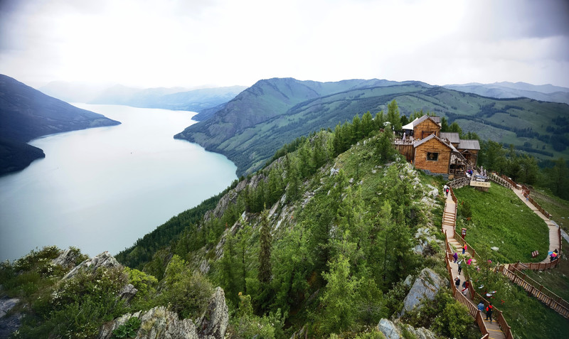 乘坐专线摆渡车,爬1068级台阶,从观鱼台上面可以俯瞰喀纳斯湖全景。