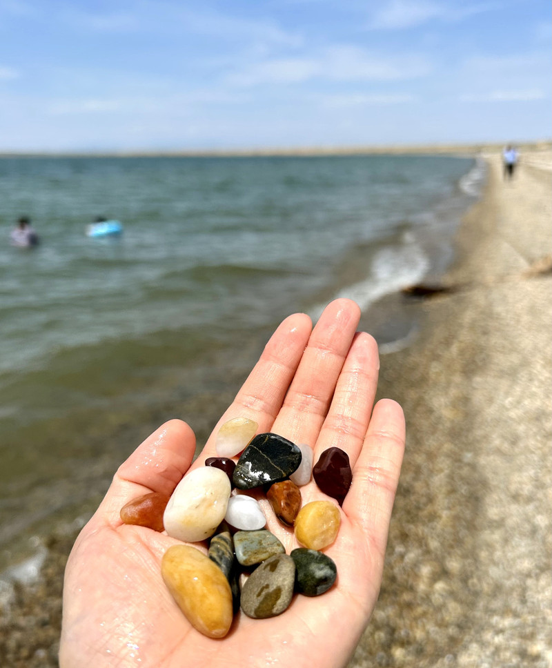 银色细滩,散落开晶莹剔透的小石头,引起了我们的注意,忘了时光,拾选心怡的幸运之石,成了一行人不期而遇的欢乐。