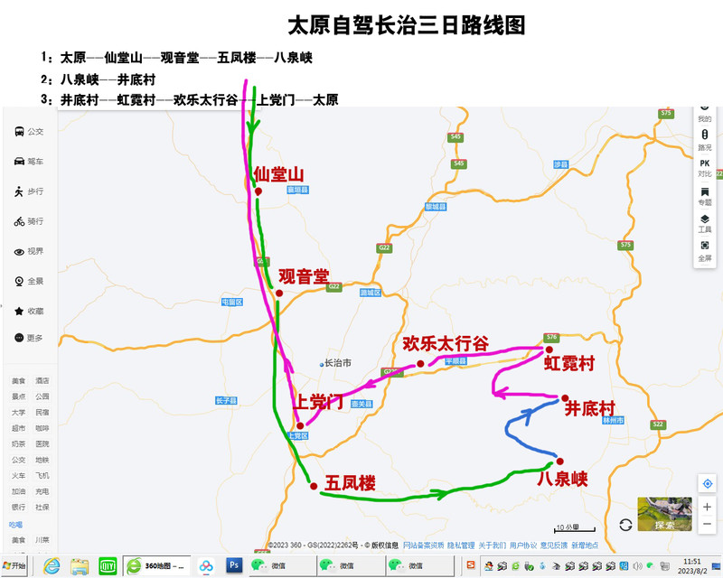 三天时间,提前做了攻略,事实上第三日从井底村到虹霓村走了河南林州高速,其他全部按照既定路线进行,图上标线懒得改了。