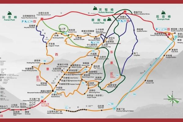 进山门——乘坐游览车到索道站——索道上到观音峰——山顶乘游览车到灵鹫峰——再乘游览车到法显峰——从法显峰步行下山路过——卧佛——观音洞——娲皇宫——仙堂寺——滴谷洞——八个馆——财神庙,再坐游览车回来。
